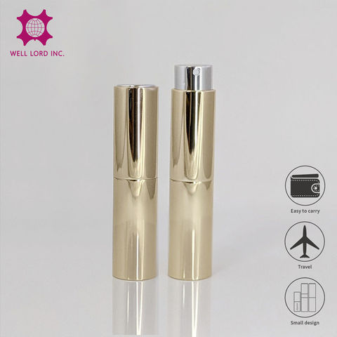 Botella de perfume de aluminio dorado brillante, embalaje de perfume de tamaño de viaje de 8ml/10ml